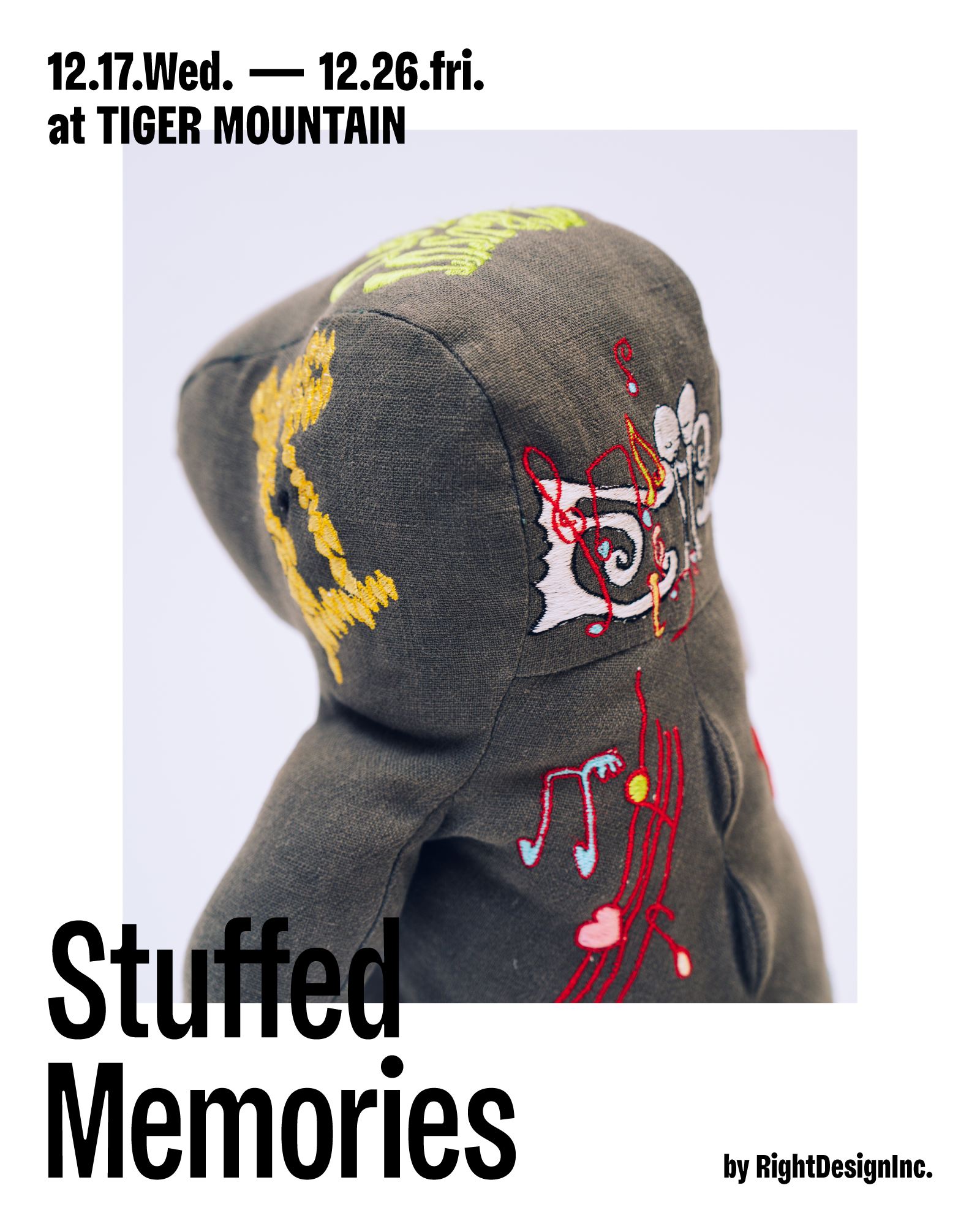 ブランドデザインスタジオRightDesignInc.は、TIGER MOUNTAINにて、モノと人間の関係性をデザインしなおすプロジェクト「Stuffed Memories」を展示します。本プロジェクトは、持ち主へのインタビューを通じてデザインしたタトゥーをぬいぐるみへ刺繍するもの。その多くが大量生産品であり、持ち主が大人になるにつれて処分されることも多かったぬいぐるみへ刺繍を施すことで、持ち主とぬいぐるみの関係性を可視化し、特別なプロダクトへと生まれ変わらせます。